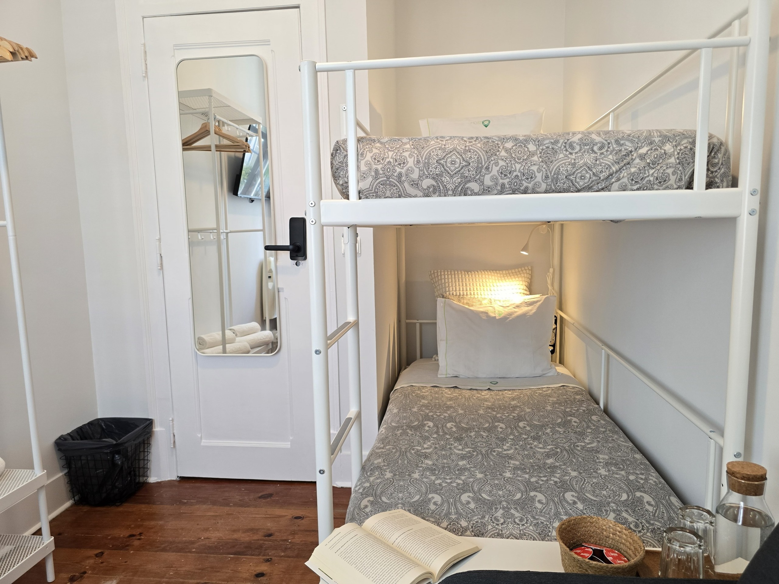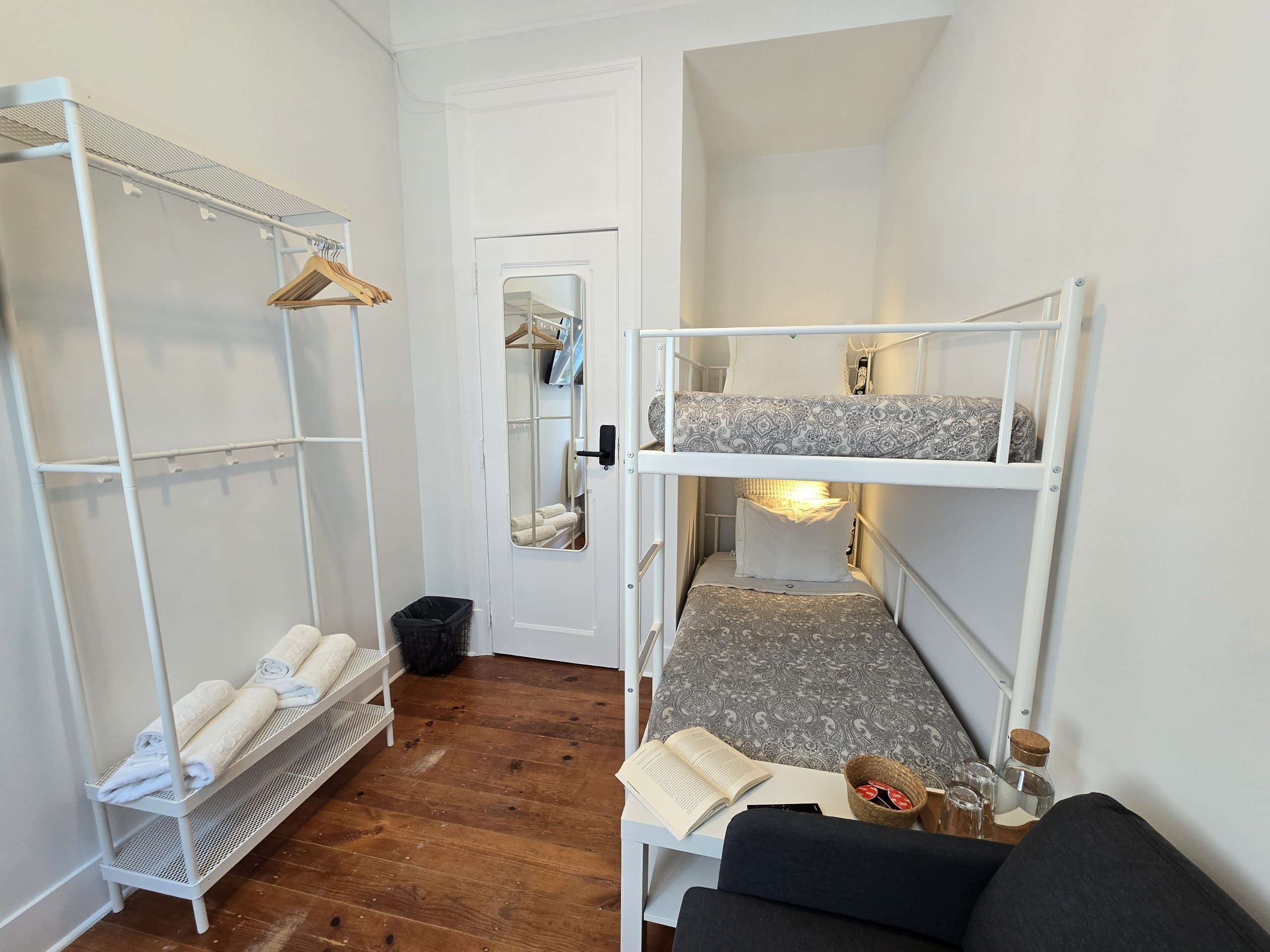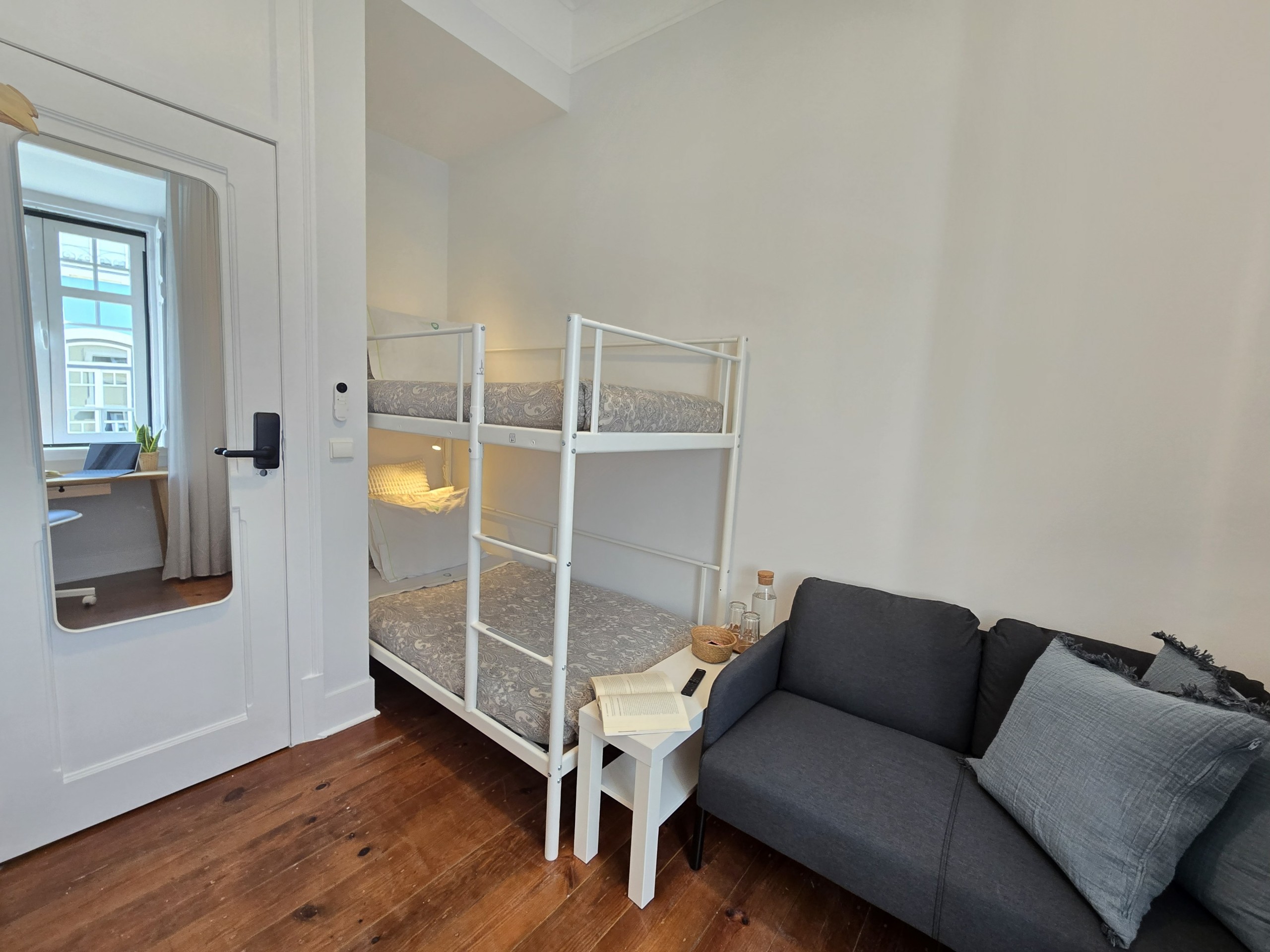 O QUARTO: Quarto em apartamento com 4 quartos, no primeiro piso de um edifício centenário, sem elevador. É o mais pequeno quarto privado do apartamento, com capacidade máxima para até 2 pessoas (se incluídos na reserva), com cama em beliche 90x200cm, aquecimento e ventoinha, roupeiro aberto e TV ecran plano 40” e wifi fibra 5G até 1Gbts. Este quarto partilha uma casa de banho completa com banheira e secador de cabelo e um duche extra, ambos fora do quarto, com mais 2 quartos do apartamento (até 6 pessoas no total).
