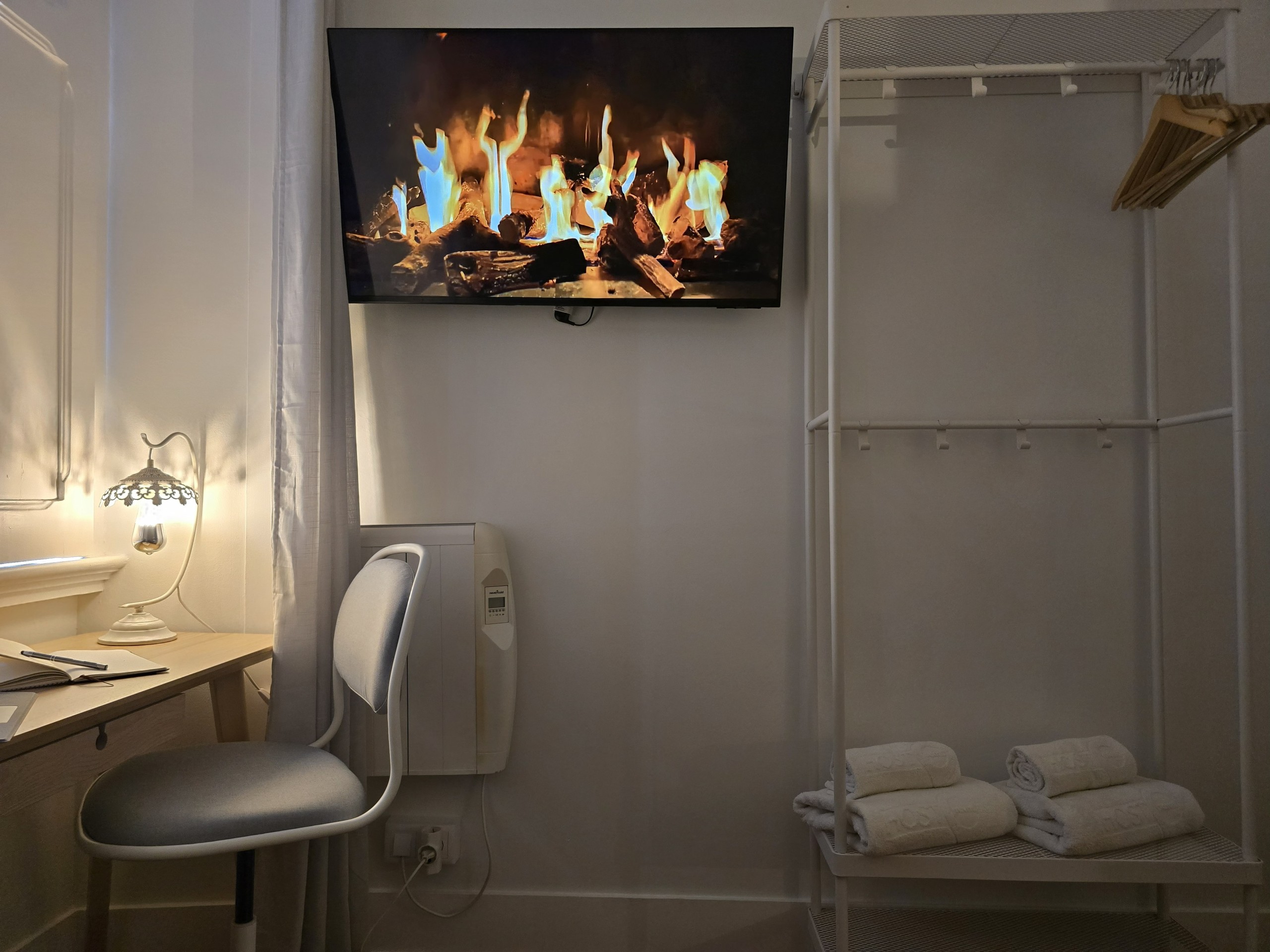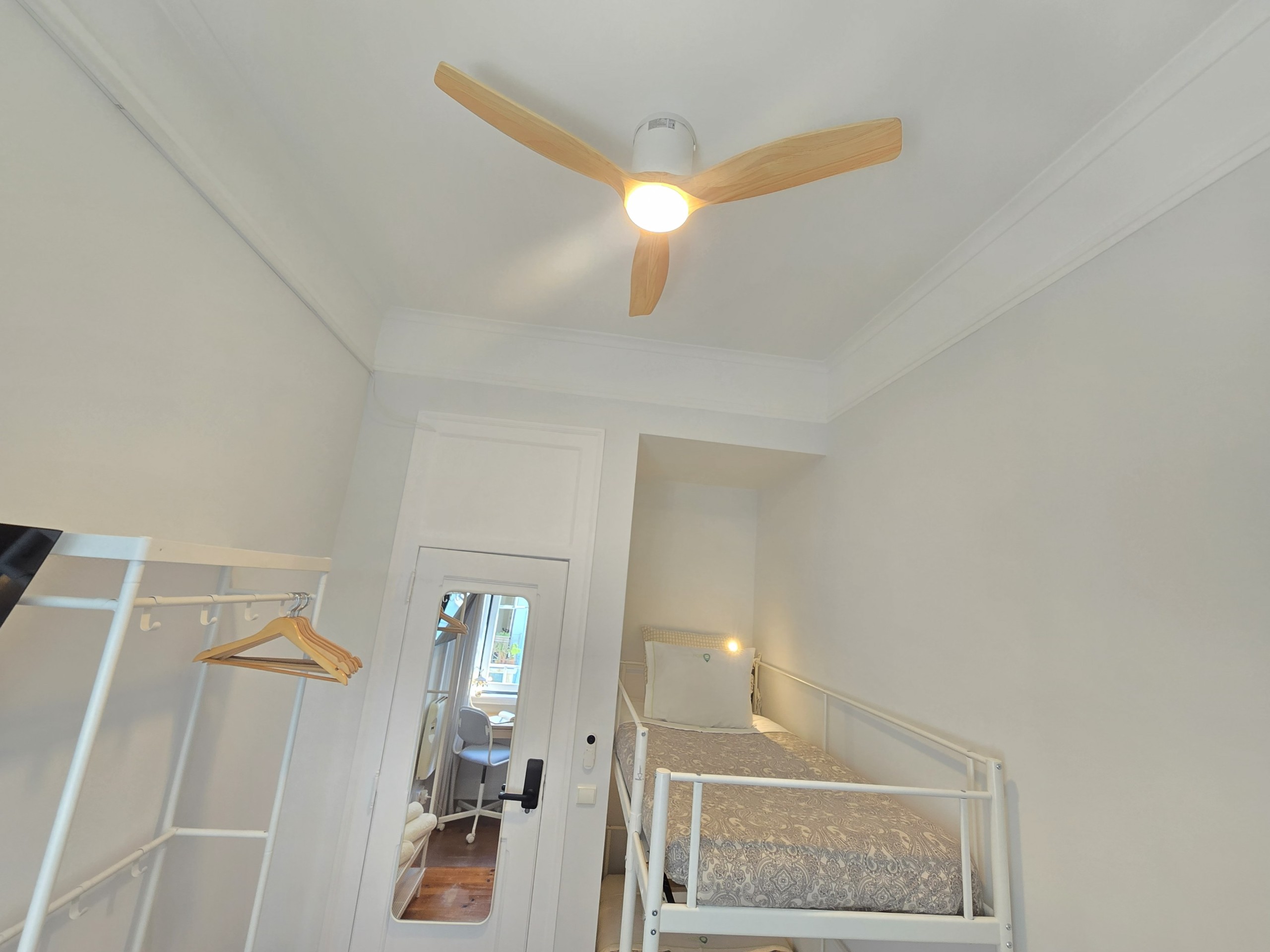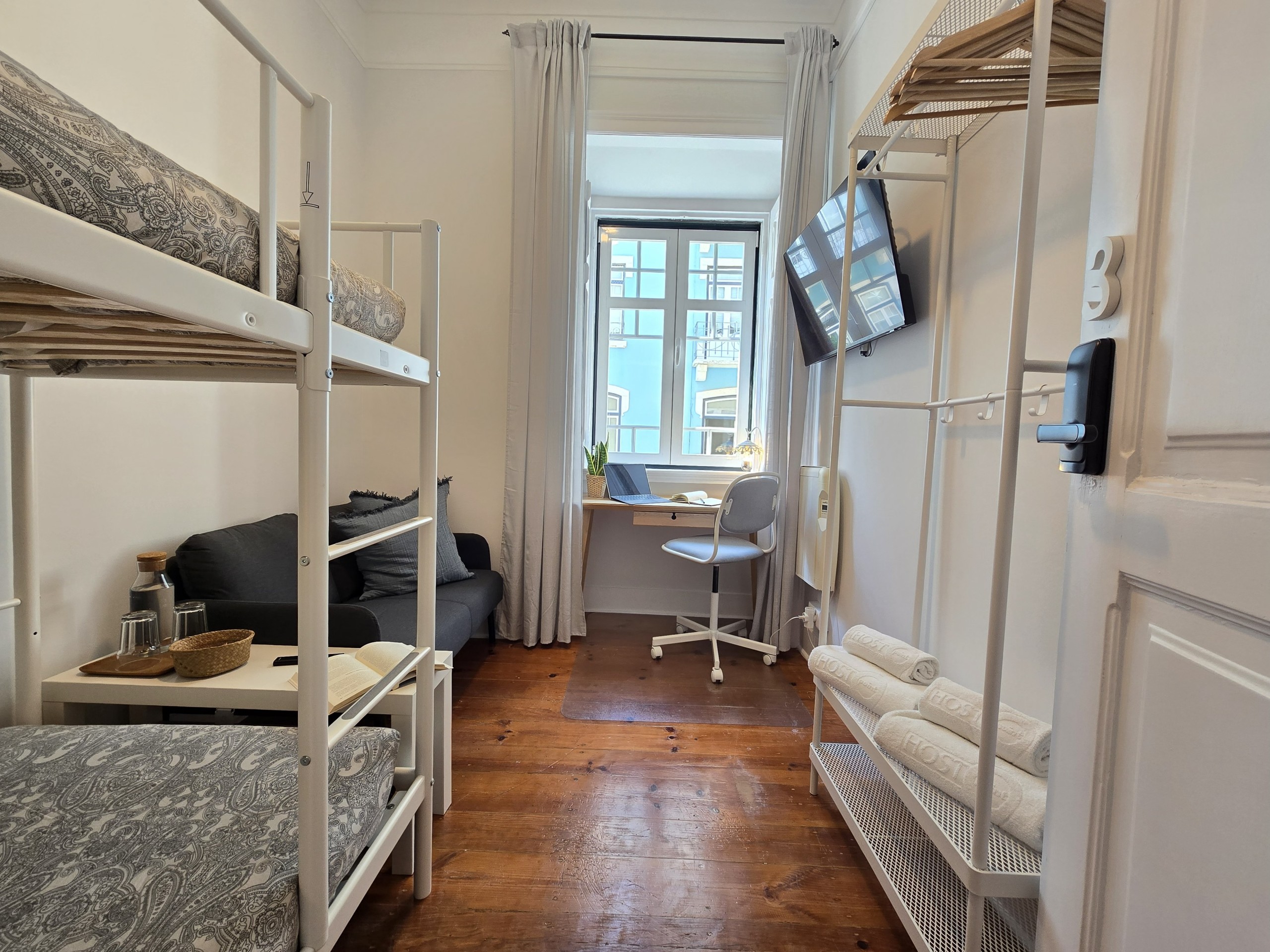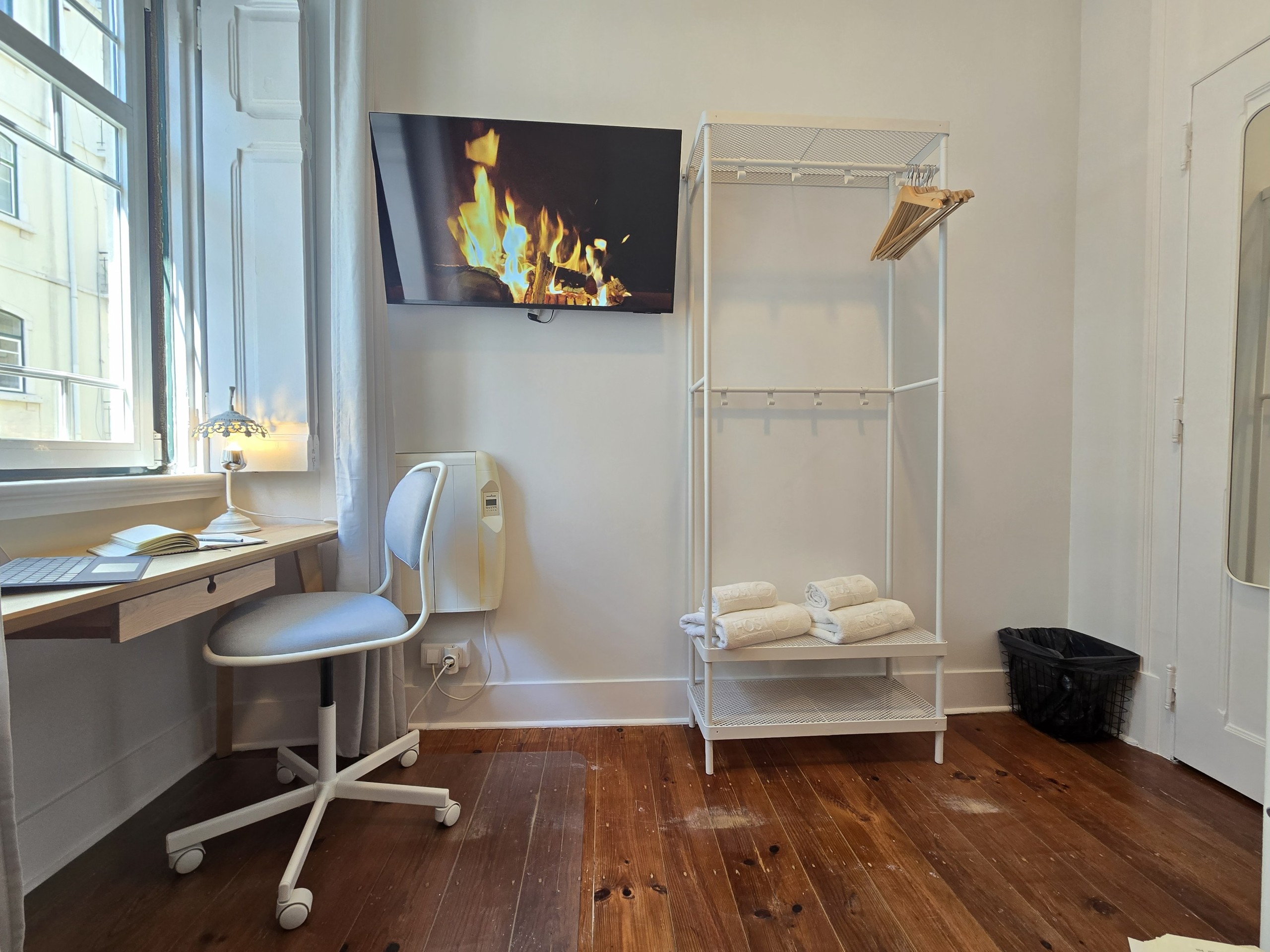 O QUARTO: Quarto em apartamento com 4 quartos, no primeiro piso de um edifício centenário, sem elevador. É o mais pequeno quarto privado do apartamento, com capacidade máxima para até 2 pessoas (se incluídos na reserva), com cama em beliche 90x200cm, aquecimento e ventoinha, roupeiro aberto e TV ecran plano 40” e wifi fibra 5G até 1Gbts. Este quarto partilha uma casa de banho completa com banheira e secador de cabelo e um duche extra, ambos fora do quarto, com mais 2 quartos do apartamento (até 6 pessoas no total).
