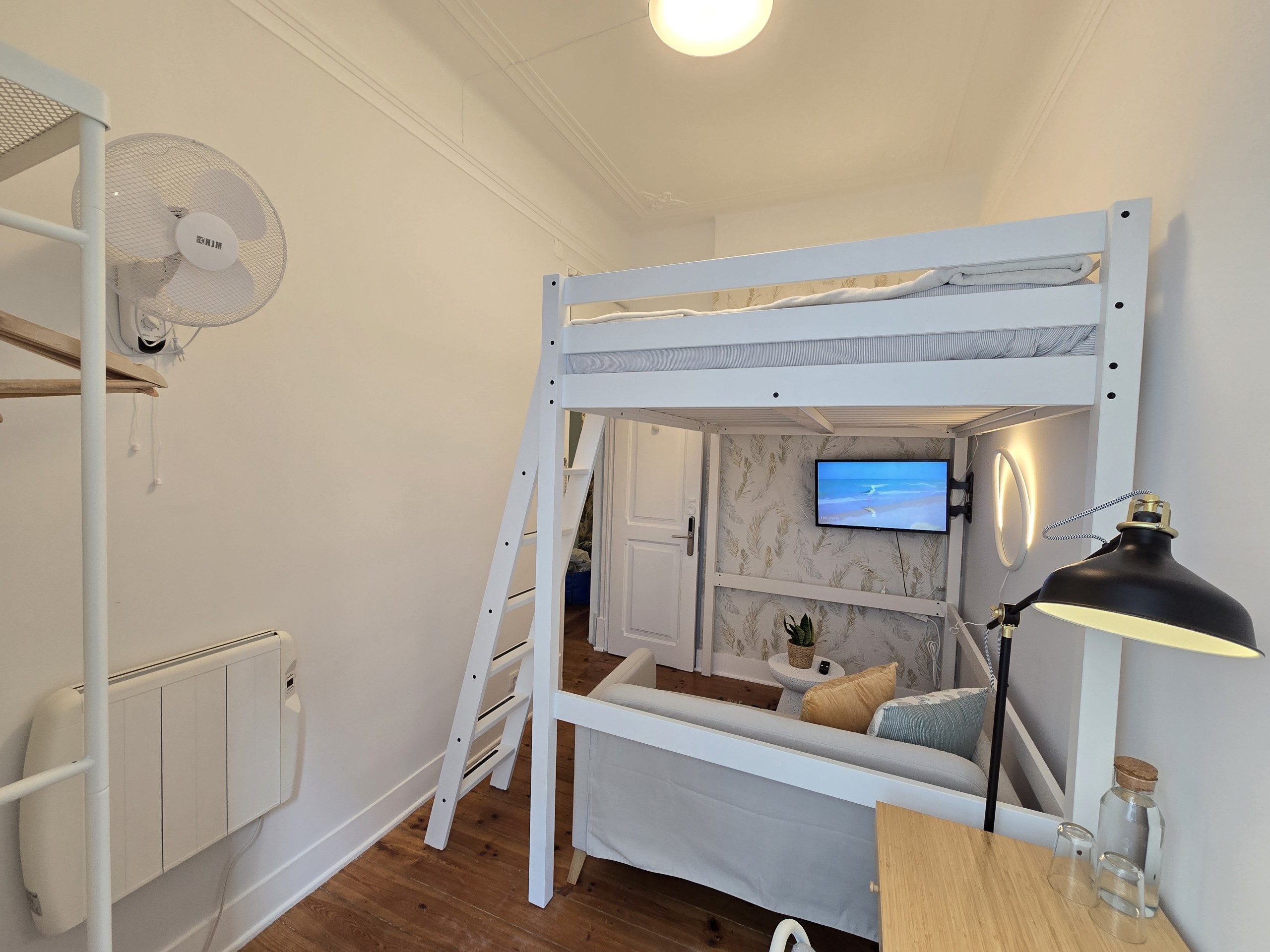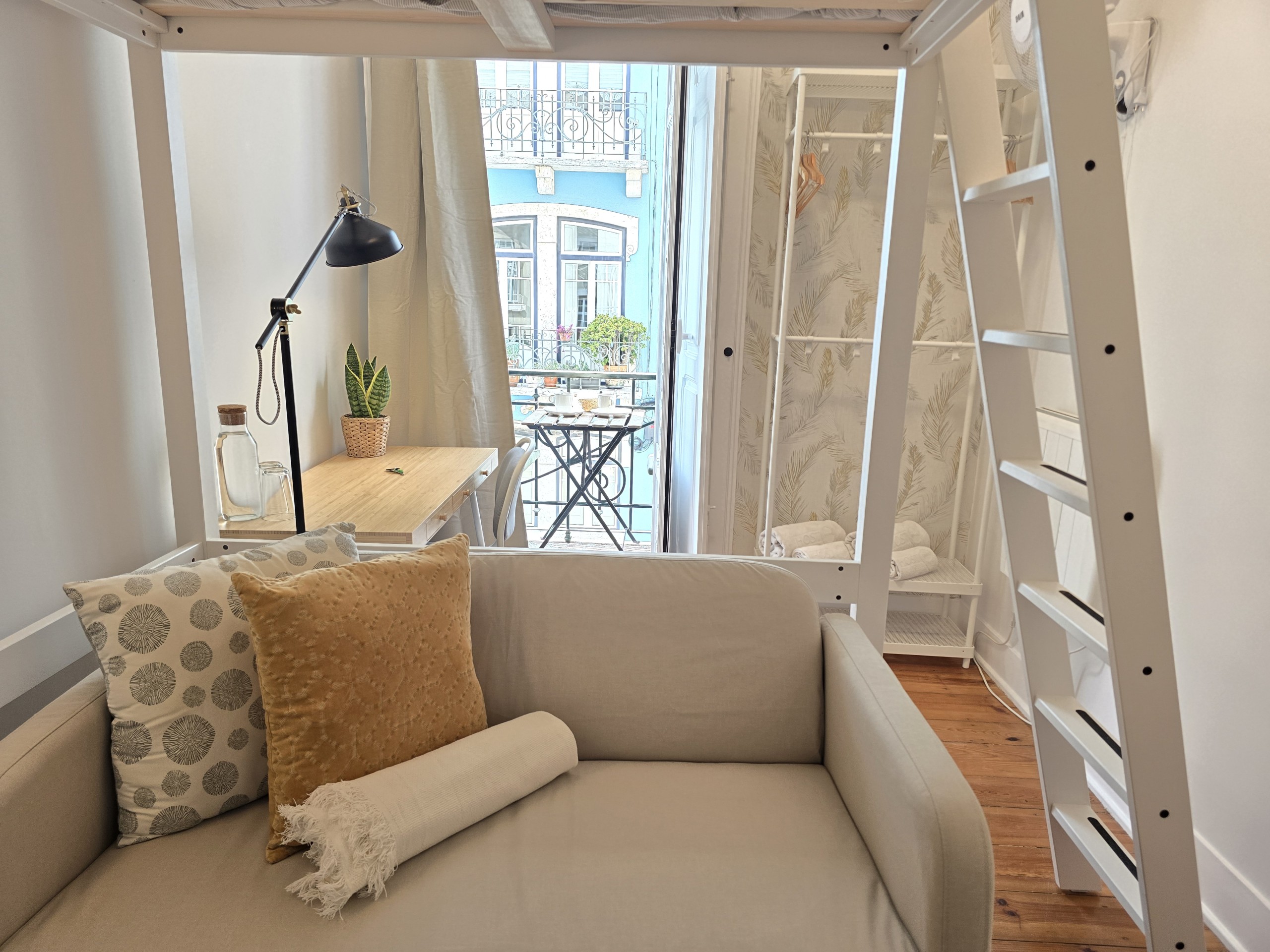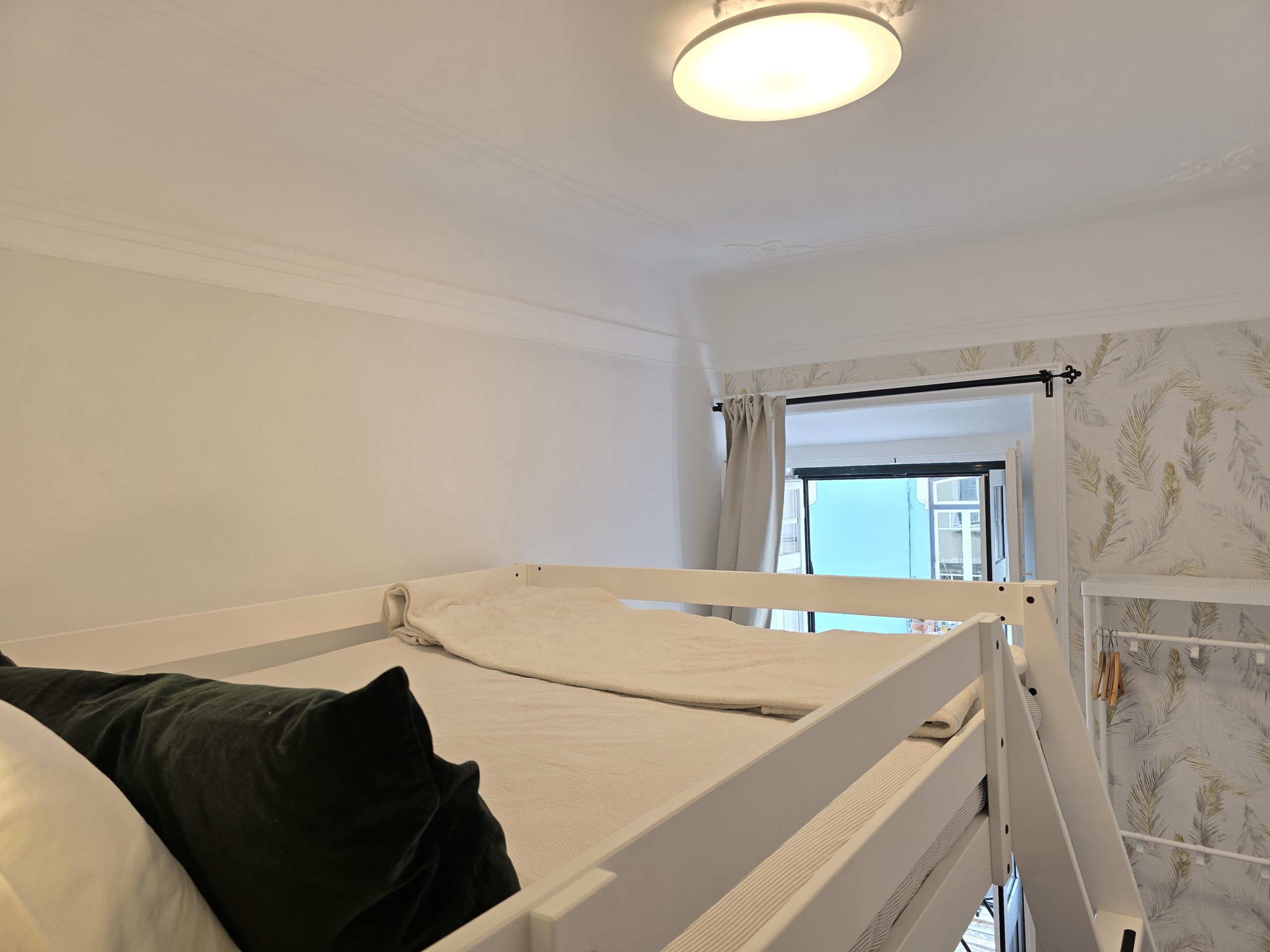O QUARTO: Quarto em apartamento com 4 quartos, no primeiro piso de um edifício centenário, sem elevador. O quarto é privado, com capacidade máxima para até 2 pessoas (se incluídos na reserva), com 1 cama de casal 140x200cm em beliche superior, pequena sala de estar privada com sofá e Smart TV 40”, aquecimento e ventoinha, roupeiro aberto, pequena varanda privada e como alguém precisa pagar as contas, há também mesa e cadeira de trabalho e wifi fibra 5G até 1Gb. Este quarto partilha uma casa de banho completa com duche e secador de cabelo, fora do quarto com mais 2 quartos do apartamento (até 5 pessoas no total).