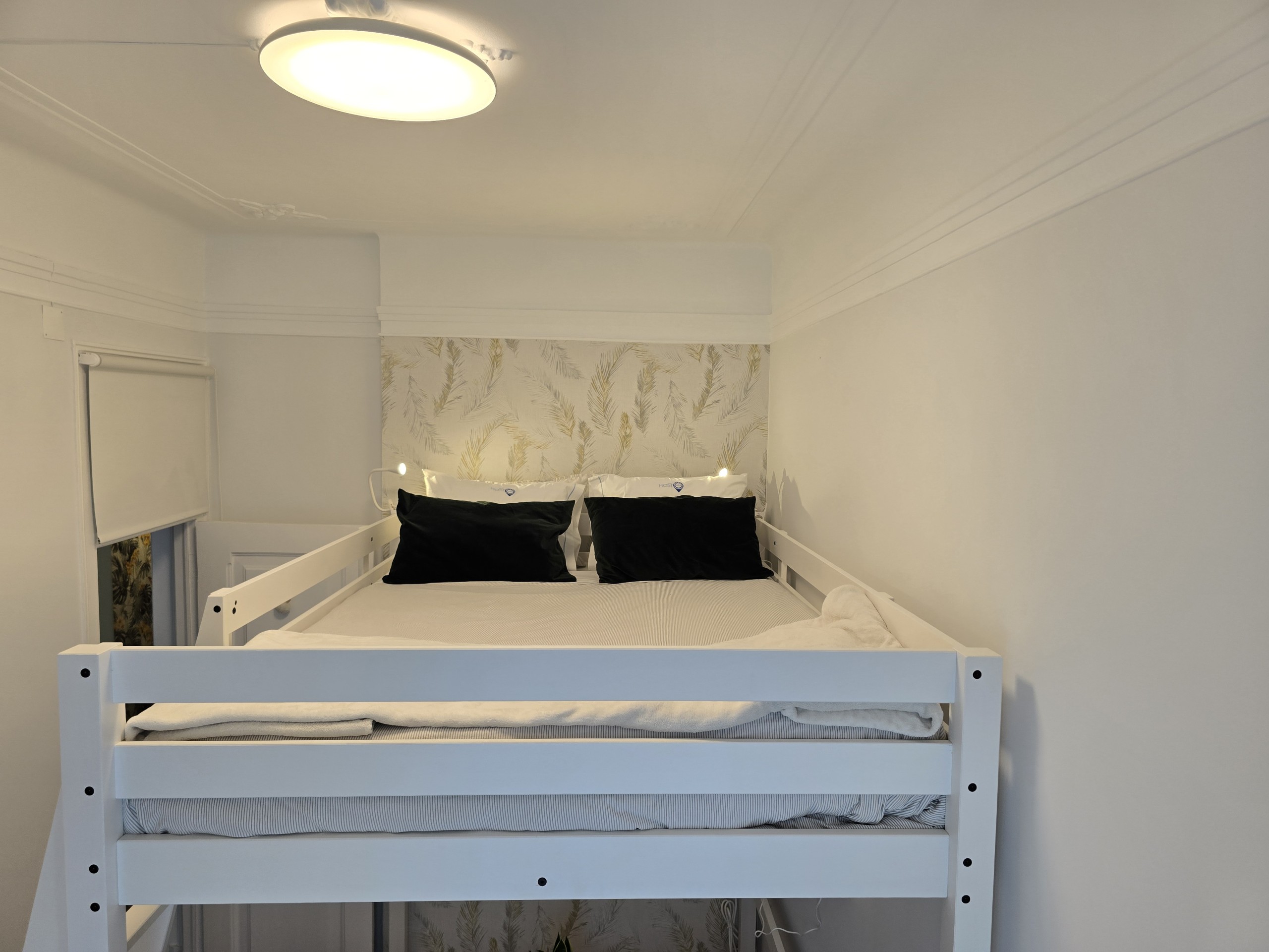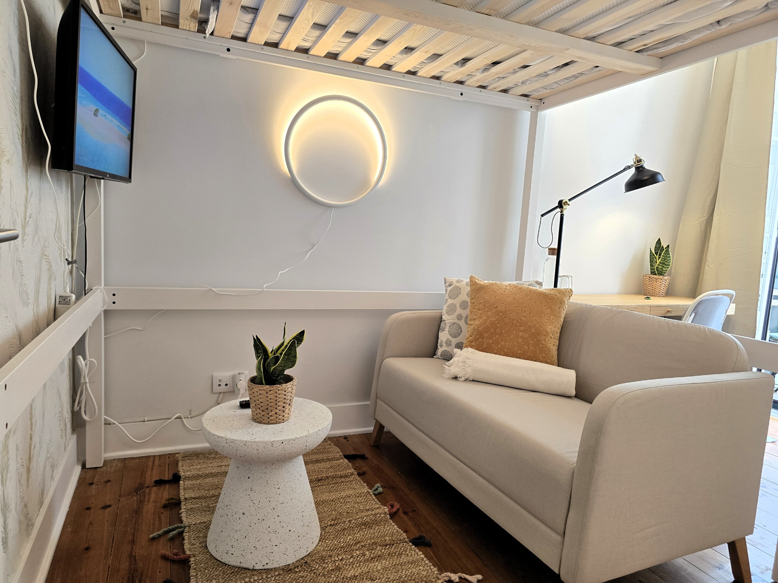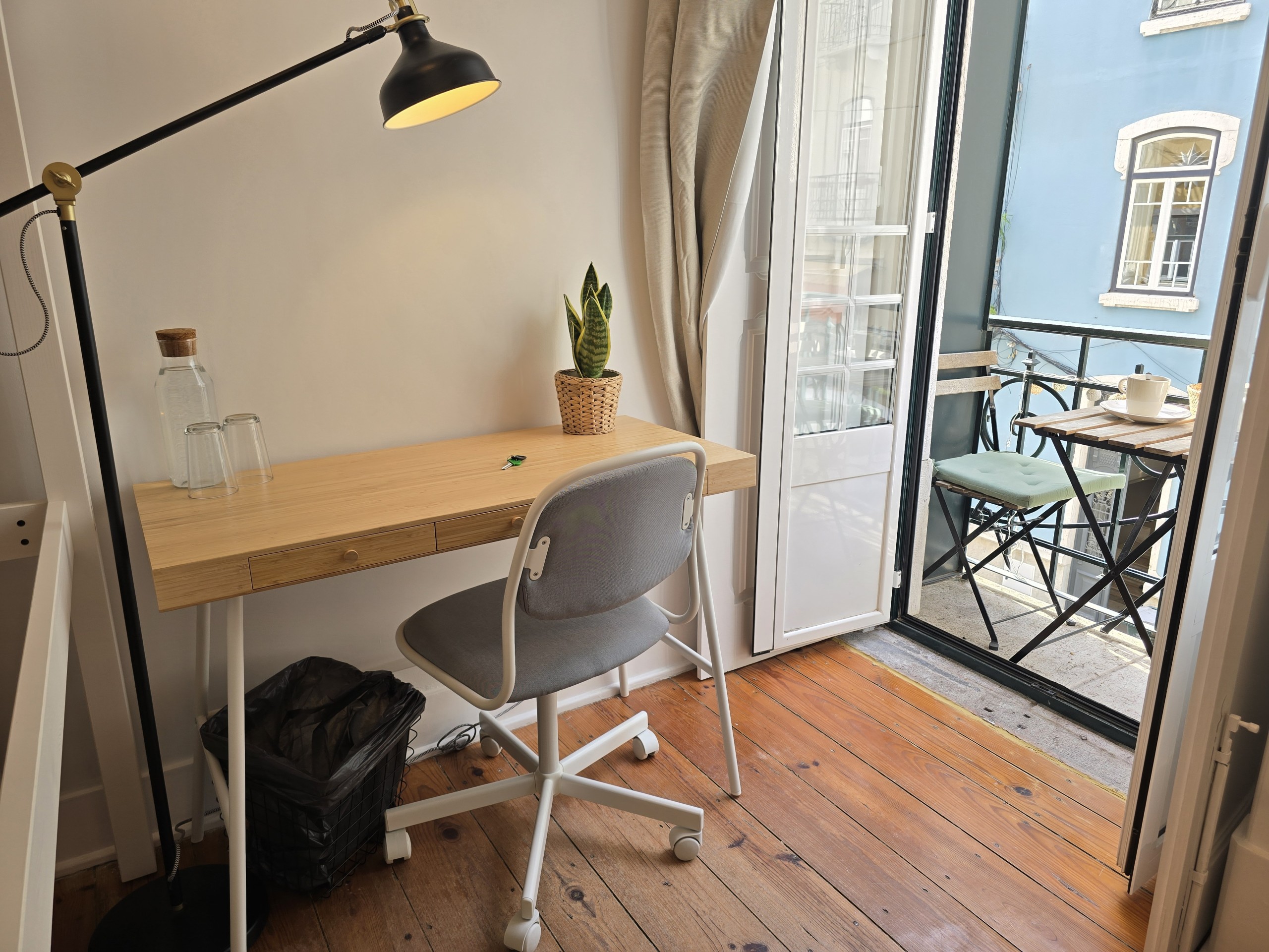 O QUARTO: Quarto em apartamento com 4 quartos, no primeiro piso de um edifício centenário, sem elevador. O quarto é privado, com capacidade máxima para até 2 pessoas (se incluídos na reserva), com 1 cama de casal 140x200cm em beliche superior, pequena sala de estar privada com sofá e Smart TV 40”, aquecimento e ventoinha, roupeiro aberto, pequena varanda privada e como alguém precisa pagar as contas, há também mesa e cadeira de trabalho e wifi fibra 5G até 1Gb. Este quarto partilha uma casa de banho completa com duche e secador de cabelo, fora do quarto com mais 2 quartos do apartamento (até 5 pessoas no total).